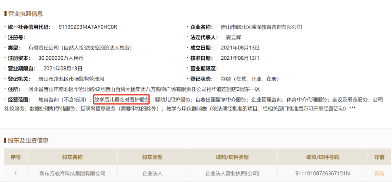 其中,唐山市路北区盛泽教育咨询有限公司经营范围含教育咨询(不含培训);放学后儿童临时看护服务;婴幼儿照护服务等。武汉新东方教育咨询有限公司经营范围则包括教育咨询服务、幼儿园外托管服务;中小学生校外托管服务等。