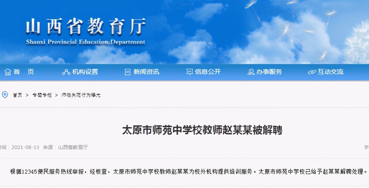 据山西省教育厅网站,山西3名教师因在校外组织学生有偿补课、为校外机构提供培训服务等被解聘。 ​​​