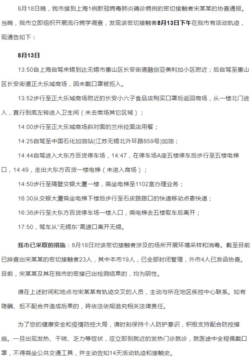 据无锡疾控,8月18日晚,我市接到上海1例新冠病毒肺炎确诊病例的密切接触者宋某某的协查通报。当晚,我市立即组织开展流行病学调查,发现该密切接触者8月13日下午在我市有活动轨迹,现通告如下图。