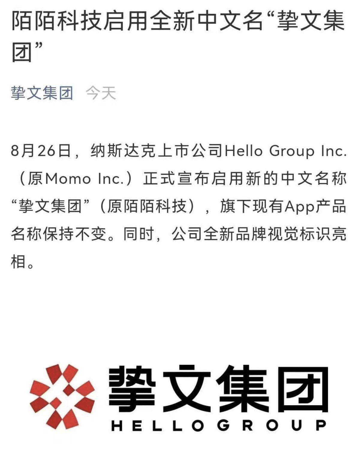 8月26日,纳斯达克上市公司Hello Group Inc.(原Momo Inc.)正式宣布启用新的中文名称“挚文集团”(原陌陌科技),旗下现有App产品名称保持不变。同时,公司全新品牌视觉标识亮相。