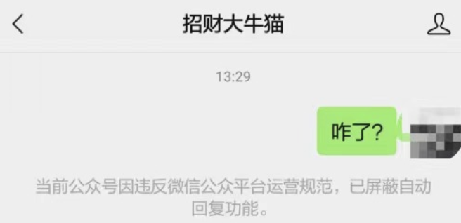 除“断更”外,中证报9月15日在“招财大牛猫”微信公众号内使用对话功能提问时,系统反馈显示,该公众号因违反微信公众平台运营规范,已屏蔽自动回复功能。