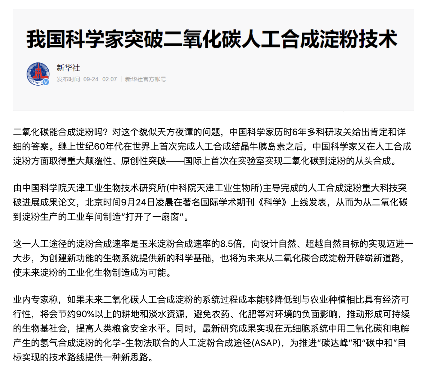 以二氧化碳为原料,不依赖植物光合作用,直接人工合成淀粉——我国科学家在实验室里首次实现二氧化碳到淀粉的从头合成,成果北京时间24日由国际学术期刊《科学》发表。