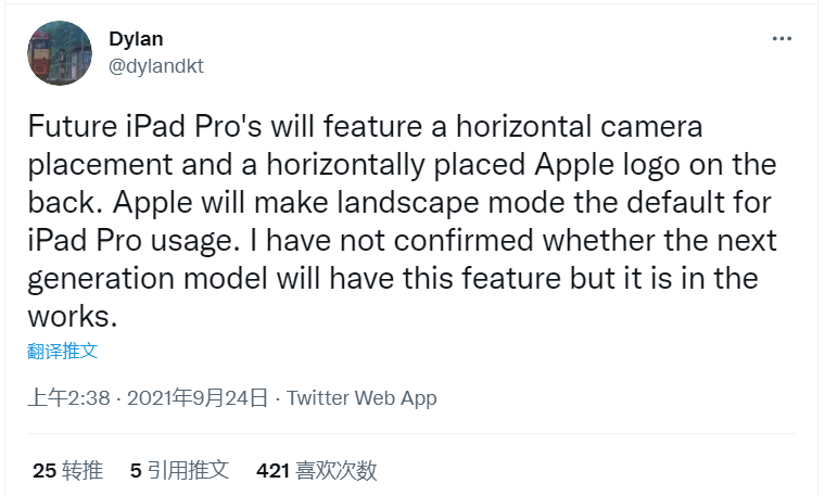 原文 “未来的 iPad Pro 将采用水平放置的摄像头,背部的苹果 Logo 也将水平放置。苹果将把横向模式作为 iPad Pro 使用的默认模式。我没有确认下一代机型是否会有这个功能,但它正在酝酿之中。”
