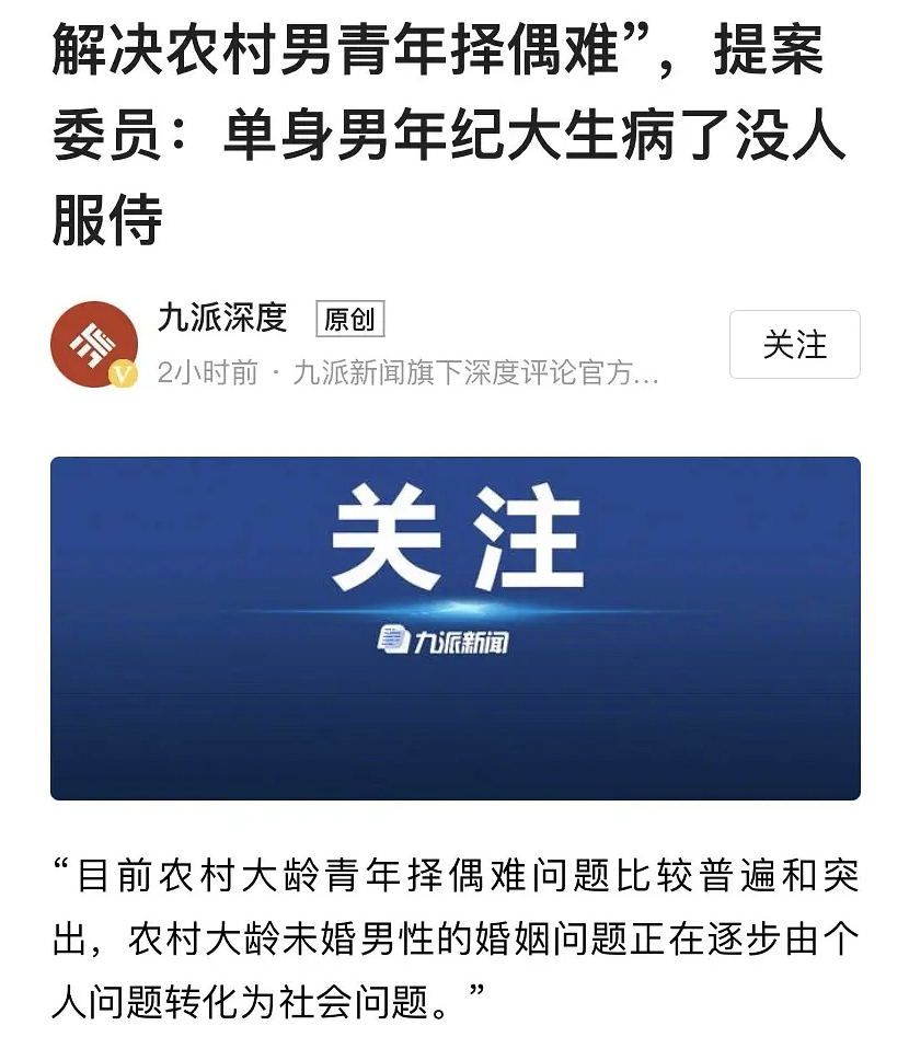 提案委员回应鼓励女青年留乡:单身男年纪大生病了没人服侍。
