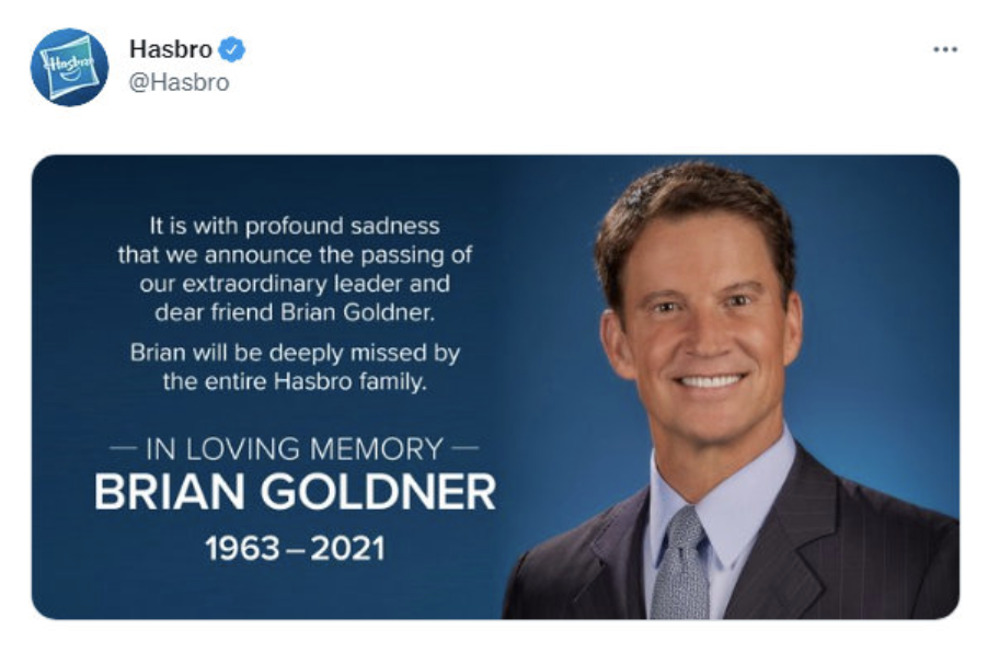 据环球时报,美国知名玩具公司“孩之宝”(Hasbro)的首席执行官布莱恩·戈德诺(Brian Goldner)已于美国当地时间本周二去世,年仅58岁。