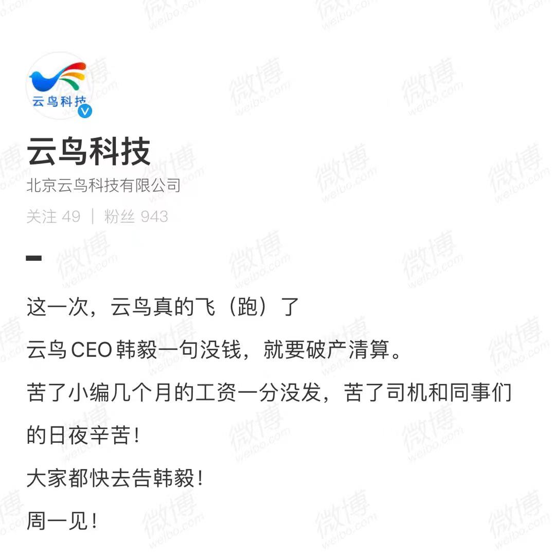 10月30日晚,北京云鸟科技有限公司(以下简称“云鸟科技”)官方账号发布了微博,控诉云鸟科技公司拖欠员工工资和司机费用,并将矛头对准其CEO:“CEO韩毅一句没钱,就要破产清算”。