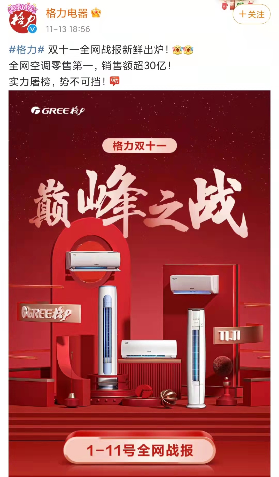 格力电器发布双十一战报:全网空调零售第一 销售额超30亿。11月13日晚间,格力电器在其微博发布双十一全网战报:全网空调零售第一,销售额超30亿。厨卫品类销售额同比增长84%;冰箱品类同比增长超33%。