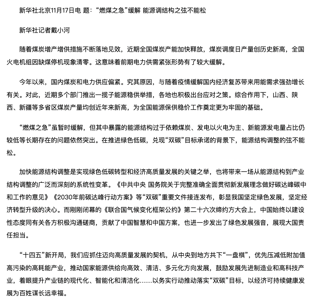 新华时评:“燃煤之急”缓解,能源调结构之弦不能松。