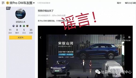 “比亚迪网络举报中心”微信公众号11月20日发布声明称,近日,懂车帝车友圈用户“逆流而上A”在平台发布网贴并配图称,“宋Pro DMi预售开始,119800到146800”。