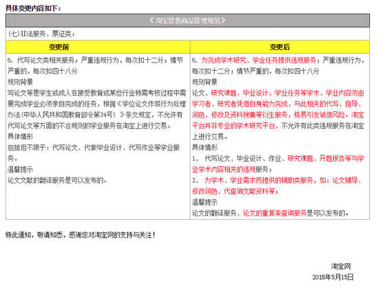 淘宝网昨日发布了“《淘宝禁售商品管理规范》关于代写论文类商品规则解读变更公示通知”。此次规则的主要变更点为:1、代写论文、毕业设计、作业、研究课题、开题报告等与学业学术内容相关的违规服务;2、为学术、学业需求而提供的辅助类服务,如:论文辅导、修改润色、代查询文献资料等。