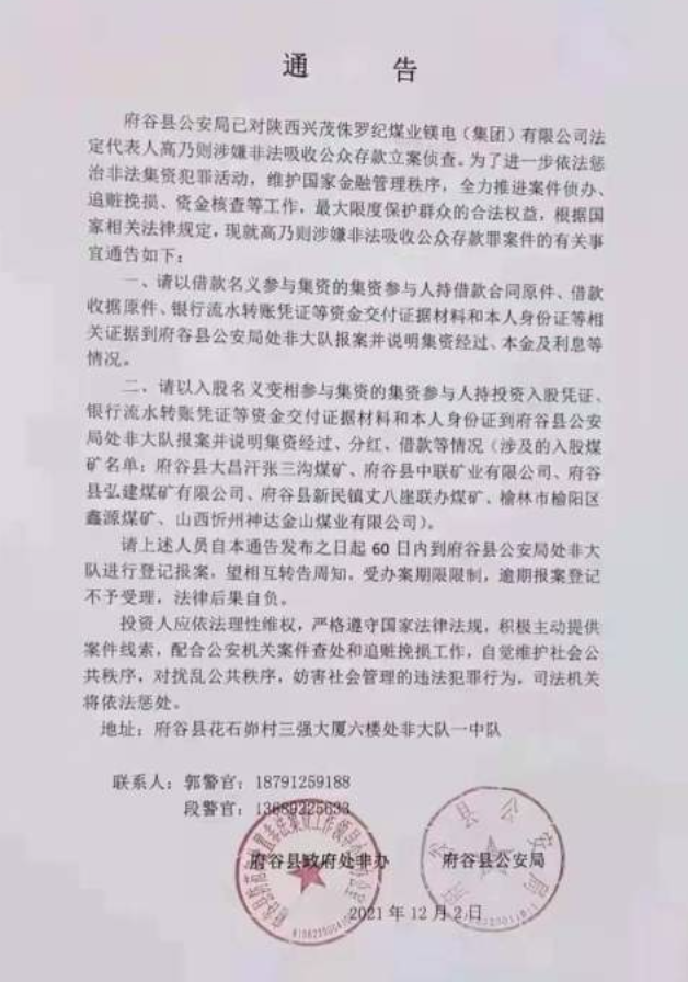 12月10日,据澎湃新闻,陕西府谷县公安局12月2日发布通告称,府谷县公安局已对陕西兴茂侏罗纪煤业镁电(集团)有限公司法定代表人高乃则涉嫌非法吸收公众存款立案侦查。为了进一步依法惩治非法集资犯罪活动,维护国家金融管理秩序,全力推进案件侦办、追赃挽损、资金核查等工作,最大限度保护群众的合法权益,根据国家相关法律规定,就高乃则涉嫌非法吸收公众存款罪案件的有关事宜发布通告。