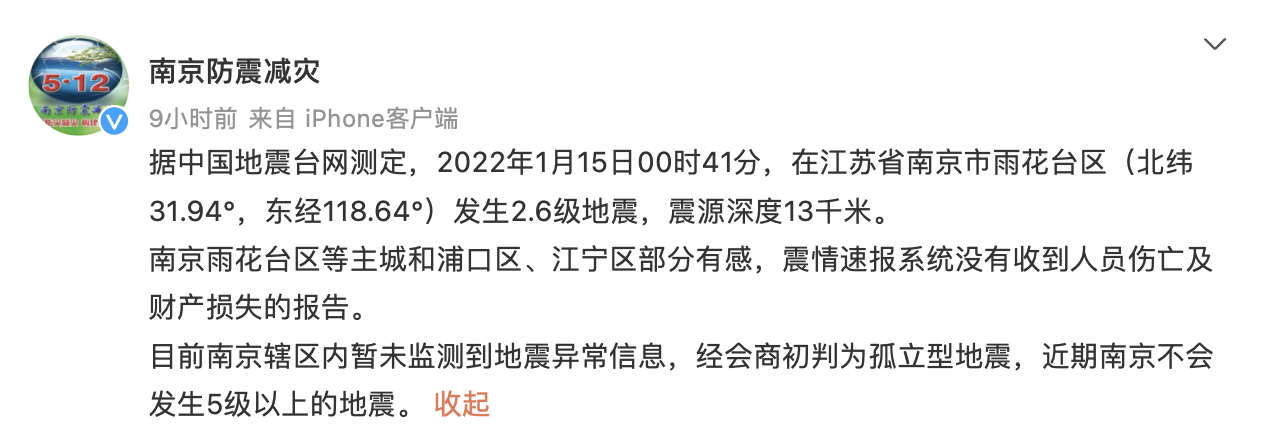 据南京防震减灾,中国地震台网测定,2022年1月15日00时41分,在江苏省南京市雨花台区(北纬31.94°,东经118.64°)发生2.6级地震,震源深度13千米。