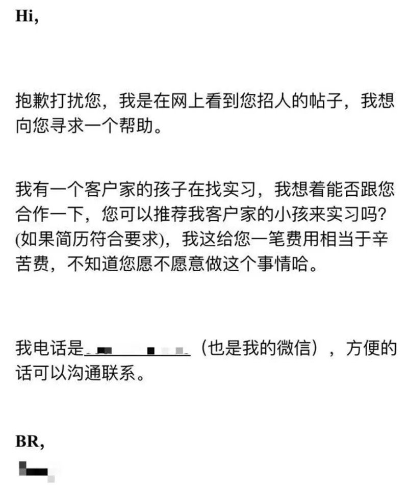 记者注意到,不仅在互联网行业,部分金融行业,例如券商,亦有在职员工通过私下向外部中介提供有偿实习岗位获利的行为。伴随招聘环境的不断变化,各类求职中介通过私联券商员工、虚假合作等方式进行招生报名宣传,甚至逐渐形成较为成熟的“有偿就业”中介产业链。