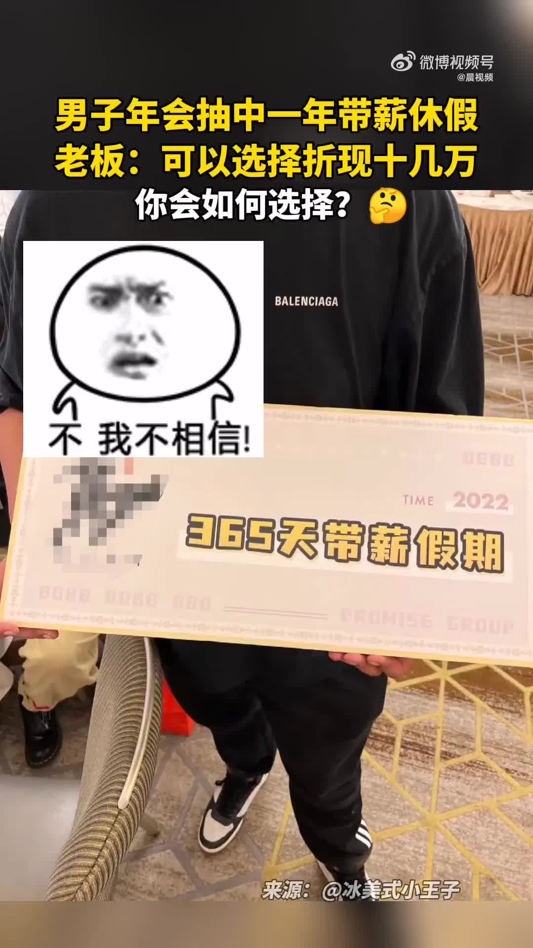 近日,广东深圳。一男子年会抽中365天带薪休假。老板表示,这个奖抽中的概率大概是1/70,假期可以折现成十几万。他设置这个奖励的目的是为了振奋人心,让大家觉得新一年更有工作希望。(via 晨视频)