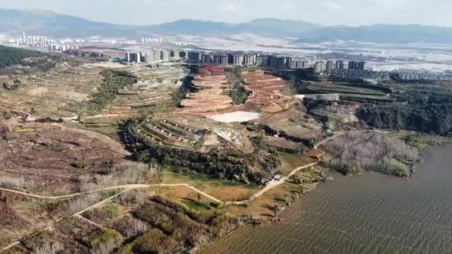 航拍别墅群夷平后的滇池长腰山:去年漫山遍野新种树均成活。