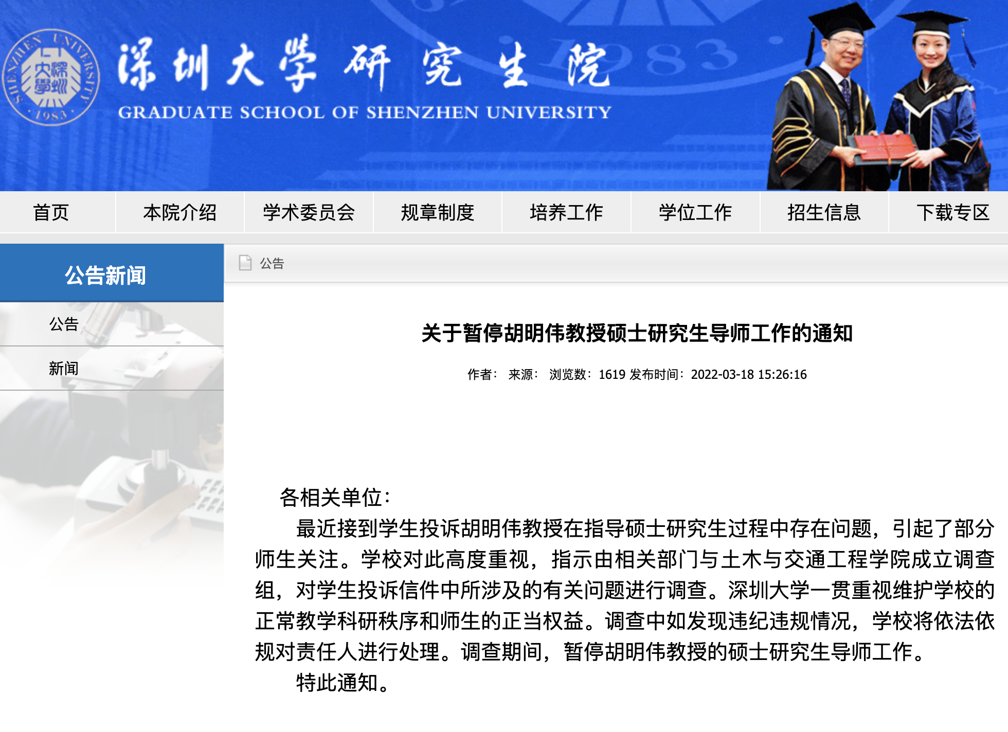 深圳大学:正调查学生投诉所涉问题,期间暂停胡明伟硕导工作。