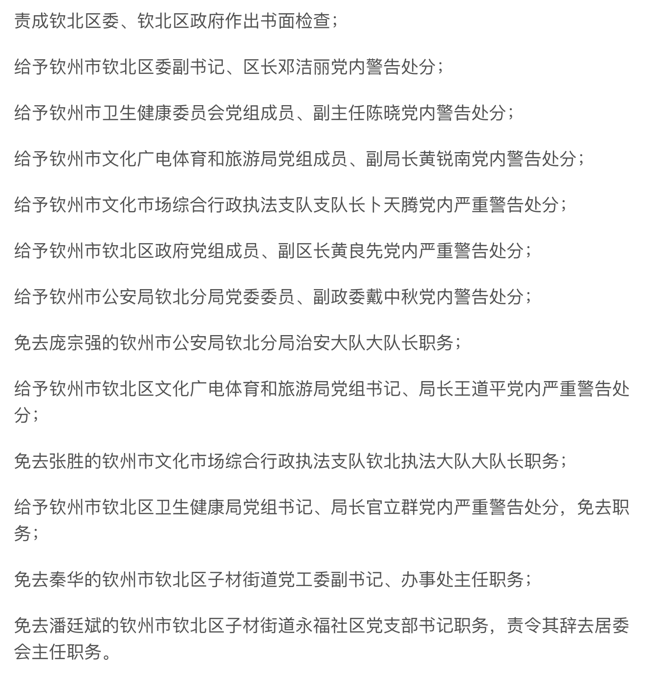 据上观新闻,日前,广西壮族自治区钦州市钦北区某KTV娱乐场所违反国家和自治区新冠肺炎疫情防控有关规定,没有落实扫码登记、测量体温等防控措施,导致发生聚集性新冠肺炎疫情。钦北区委、钦北区政府,钦北区子材街道办、永福社区,以及卫健、文广、公安等职能部门履行疫情防控职责不力,监管走过场、工作流于形式。经自治区党委研究决定,对相关责任单位及责任人失职失责问题进行处理,现予公开通报。具体如下图。