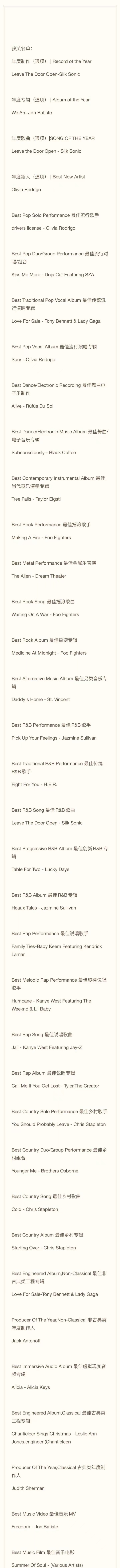第64届格莱美音乐颁奖礼获奖名单公布!