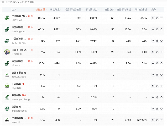 在抖音、淘宝等平台上,中国邮政旗下的北京邮政、锦江邮政、中山邮政、合肥邮政、新乡邮政、贵州邮政、杭州邮政等都开始了直播业务。
