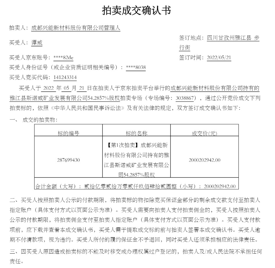 斯诺威锂矿控股权拍卖落锤:成交价超20亿。3448次出价、鏖战通宵竞标、近百万人围观,这场火出圈的拍卖最终以惊人的价格在今日早晨落锤。以20亿价格计算,以及对应股权下高达8.5亿的债务,中标公司要为此付出近28.5亿元的成本。