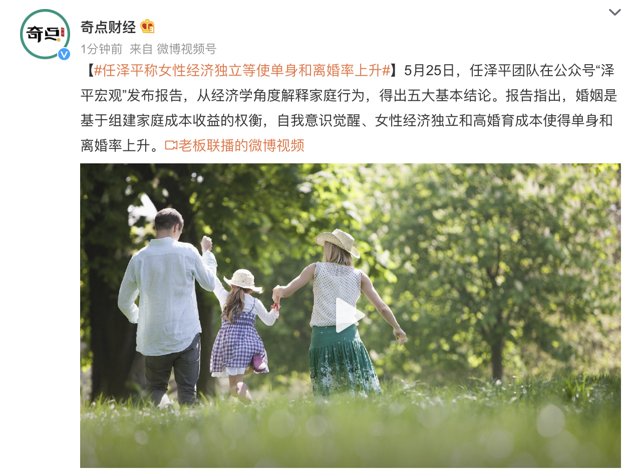 任泽平称女性经济独立等使单身和离婚率上升。