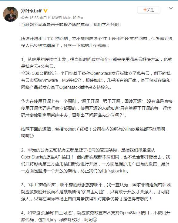 昨天,华为云BU总裁郑叶来在微博发文谈及云计算行业的开源和自主可控问题。他表示,国家非特定保密领域就应该鼓励开放而不是鼓动所谓的“自主可控”,“如果这么强调自主可控,就应该勇敢宣布不支持OpenStack接口,不使用开源代码。”这番表态疑似在喊话阿里云。此前,阿里云副总裁李津曾表示,目前中国云计算呈现出两种发展路径:一种是从底层操作系统开始自主研发,比如阿里云的飞天;一种是基于OpenStack等第三方软件搭建,比如腾讯云、华为云。
