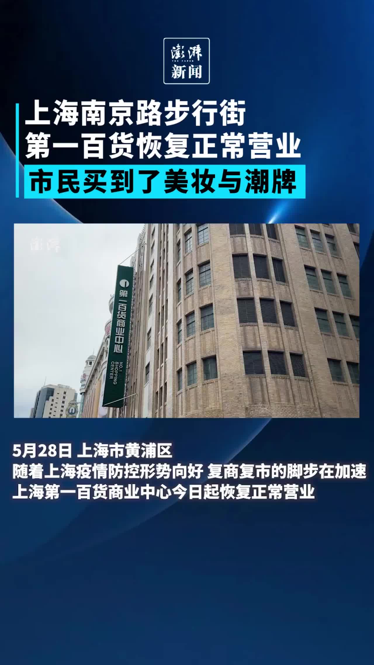 上海南京路第一百货恢复营业。5月28日,上海市黄浦区。随着上海疫情防控形势向好,复商复市的脚步在加速,上海第一百货商业中心今日起恢复正常营业,门店进出门口设置“场所码”和“数字哨兵”。(via 七环视频)