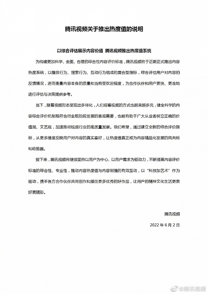 6月2日,腾讯视频发布关于推出热度值的说明称,为构建更加科学、全面、合理的综合性内容评价标准,腾讯视频将于近期正式推出内容热度系统,以播放行为、搜索行为、互动行为组成的复合型指标,综合评估用户对内容的反馈情况,进而衡量内容本身的质量和当前受欢迎程度,为合作伙伴和用户更快、更准地进行评估与决策提供参考。腾讯视频表示,希望通过建立全新的综合评价指标,从更多维度反映用户对内容的真实喜好。