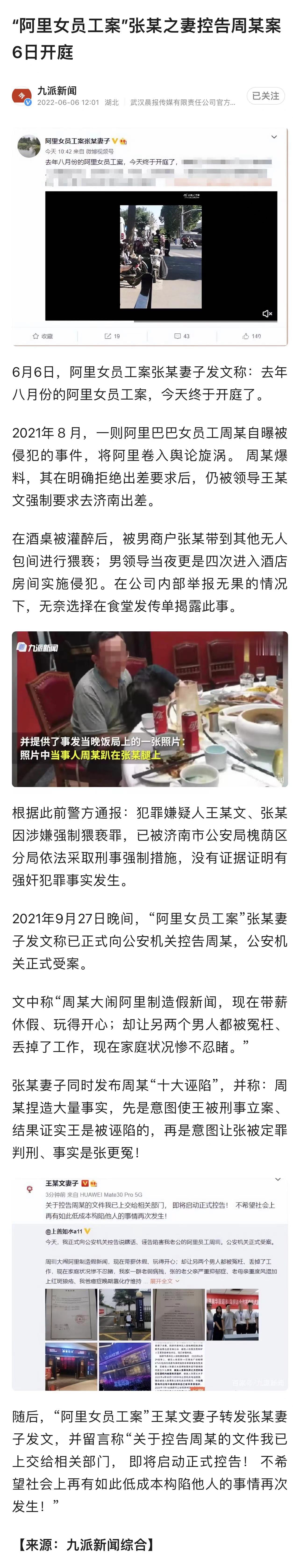 6月6日,据九派新闻综合报道,阿里女员工案张某妻子发文称:去年八月份的阿里女员工案,今天终于开庭了。