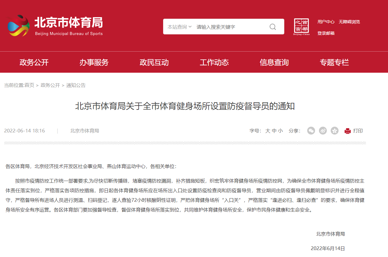 北京市体育局发布关于全市体育健身场所设置防疫督导员的通知。即日起各体育健身场所应在场所出入口处设置防疫检查岗和防疫督导员,营业期间由防疫督导员佩戴明显标识并进行全程值守,严格督导所有进场人员进行测温、扫码登记,逐人查验72小时核酸阴性证明,严把体育健身场所“入口关”,严格落实“逢进必扫、逢扫必查”的要求,确保体育健身场所安全有序运营。