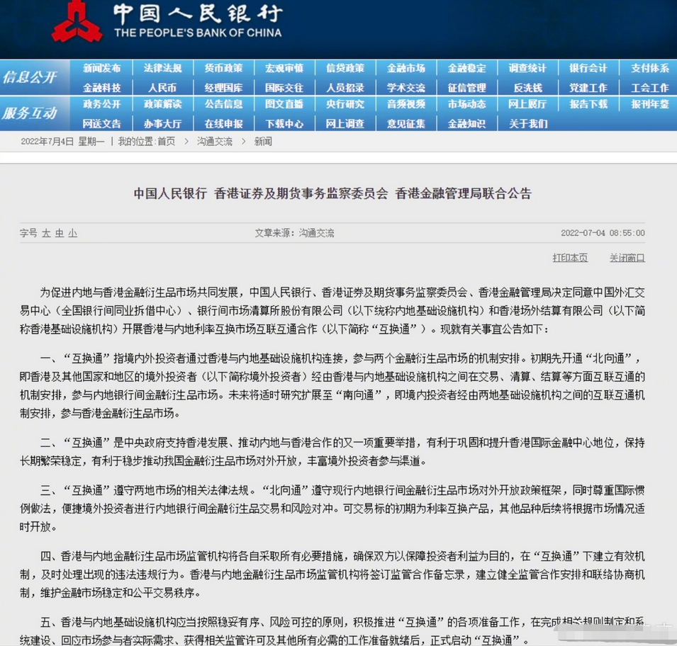 2022年7月4日,中国人民银行、香港证券及期货事务监察委员会、香港金融管理局发布联合公告,开展香港与内地利率互换市场互联互通合作。“互换通”业务通过两地金融市场基础设施连接,使境内外投资者能够在不改变交易习惯、有效遵从两地相关市场法律法规的前提下,便捷地完成人民币利率互换的交易和集中清算,不仅有利于投资者管理利率风险,也有利于巩固香港国际金融中心地位。