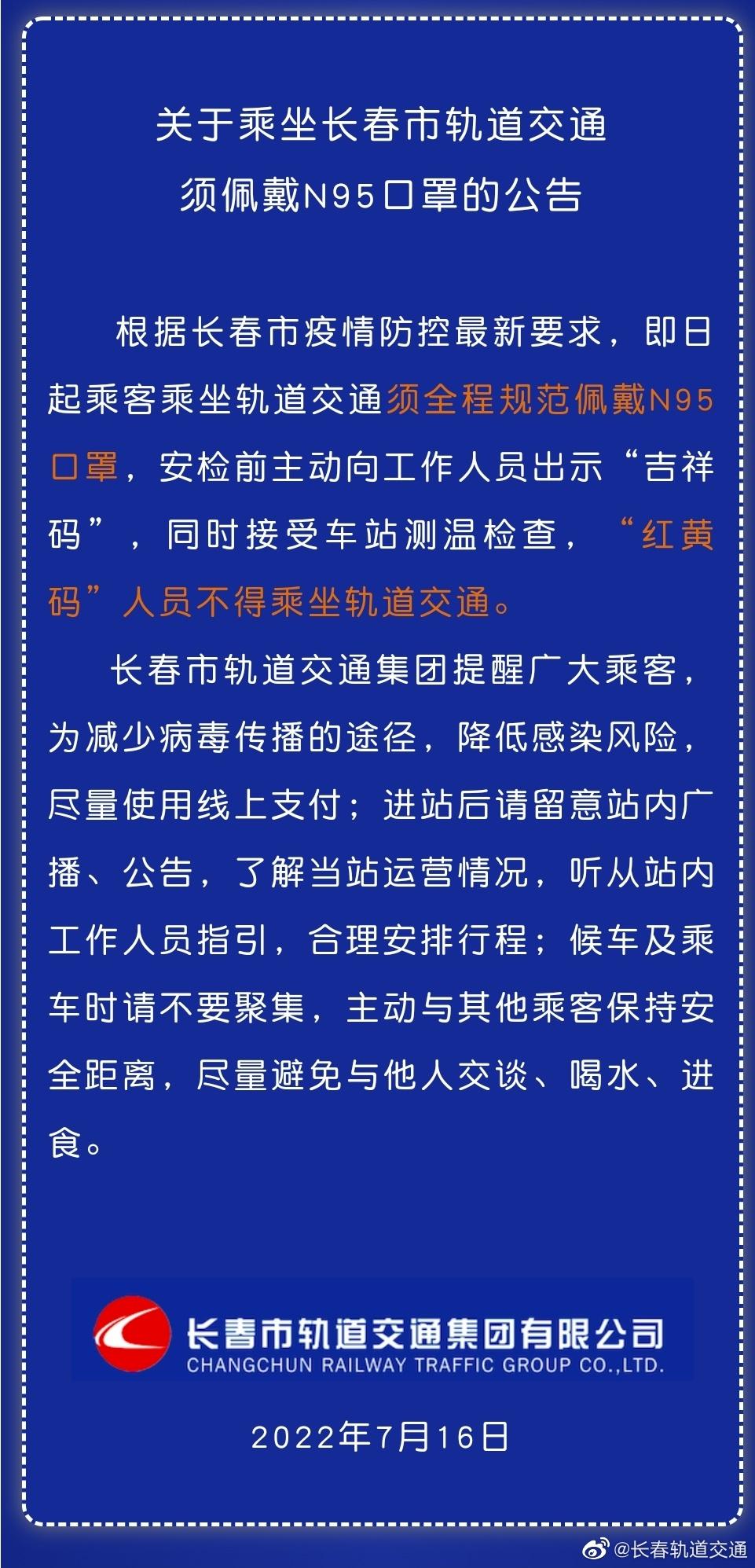 据长春轨道交通集团消息,根据长春市疫情防控最新要求,即日起乘客乘坐轨道交通须全程规范佩戴N95口罩,安检前主动向工作人员出示“吉祥码”,同时接受车站测温检查,“红黄码”人员不得乘坐轨道交通。