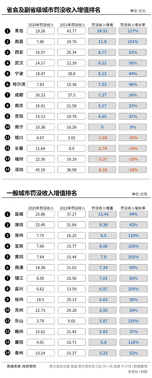 2022年7月,各城市陆续公布2021年的预算执行情况。南方周末记者统计了全国300余个地级市的罚没收入。其中,有111个地级市公布了罚没收入数据。