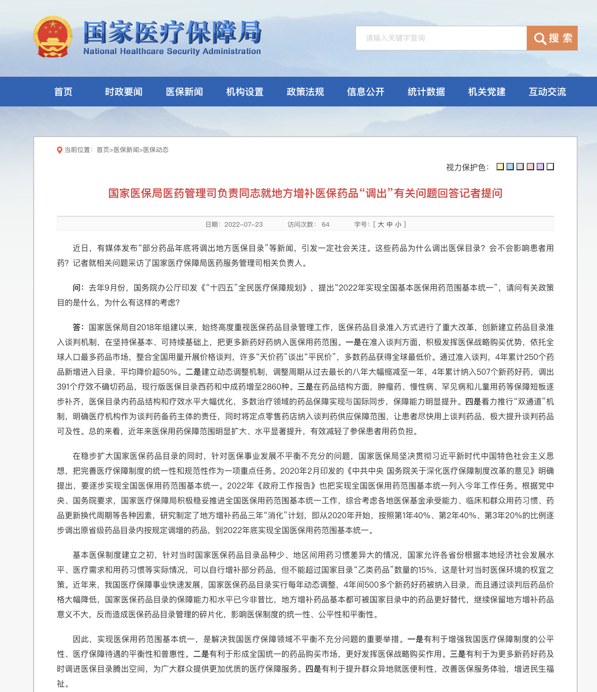 国家医保局医药管理司负责同志还表示,近年来,我国医疗保障事业快速发展,国家医保药品目录实行每年动态调整,4年间500多个新药好药被纳入目录,而且通过谈判后药品价格大幅降低,国家医保药品目录的保障能力和水平已今非昔比,地方增补药品基本都可被国家目录中的药品更好替代,继续保留地方增补药品意义不大,反而造成医保药品目录管理的碎片化,影响医保制度的统一性、公平性和平衡性。