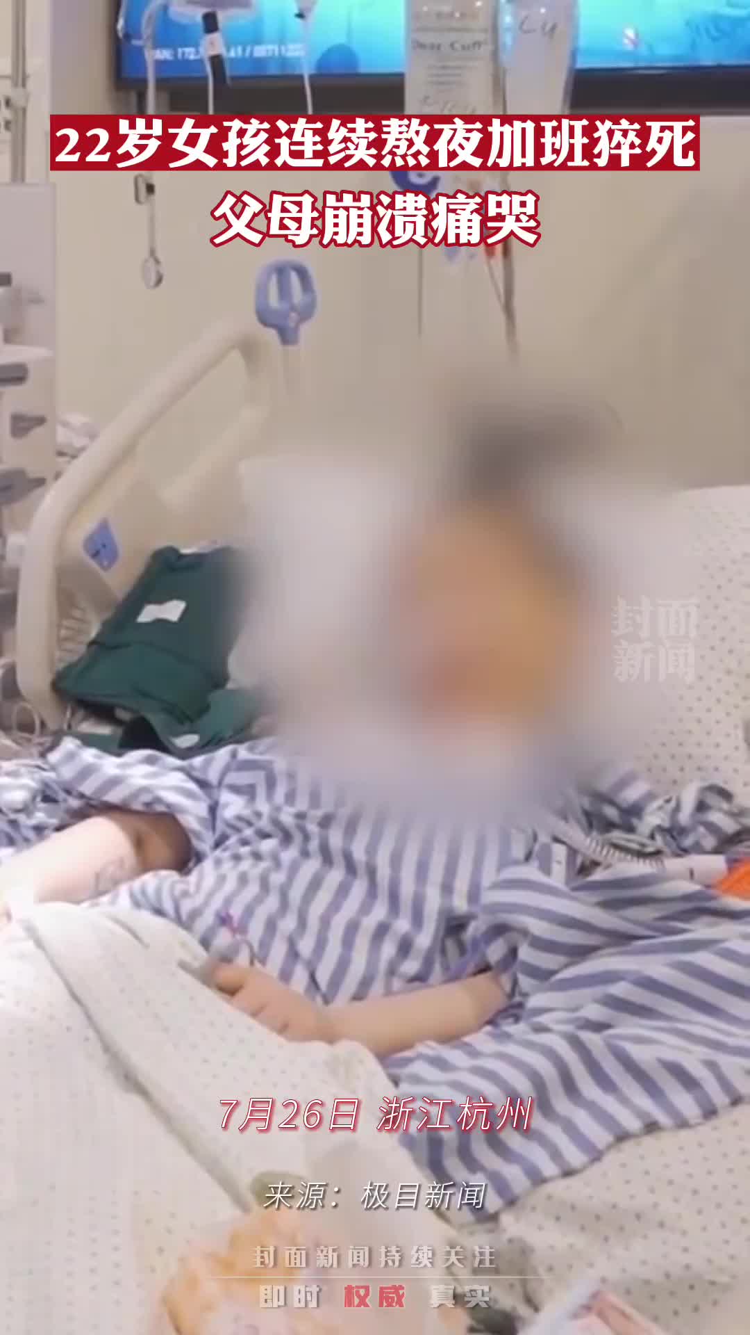 近日,浙江一22岁女孩在家休息时突然失去意识。女孩被送进急诊ICU抢救数天,26日不幸去世。女孩的侄女表示,女孩的哥哥十年前因车祸去世, 她独自承担起家中的债务,为此拼命工作。女孩堂哥表示,她一直熬夜加班,事发前还出现了感冒、胸闷不适的症状,受父亲和公司催促才决定请假看病在家休息。女孩被送往医院抢救时,因其父母难于支付医疗费用,公司以欠条形式帮其垫付了10万,募集数万元后不再帮助。
