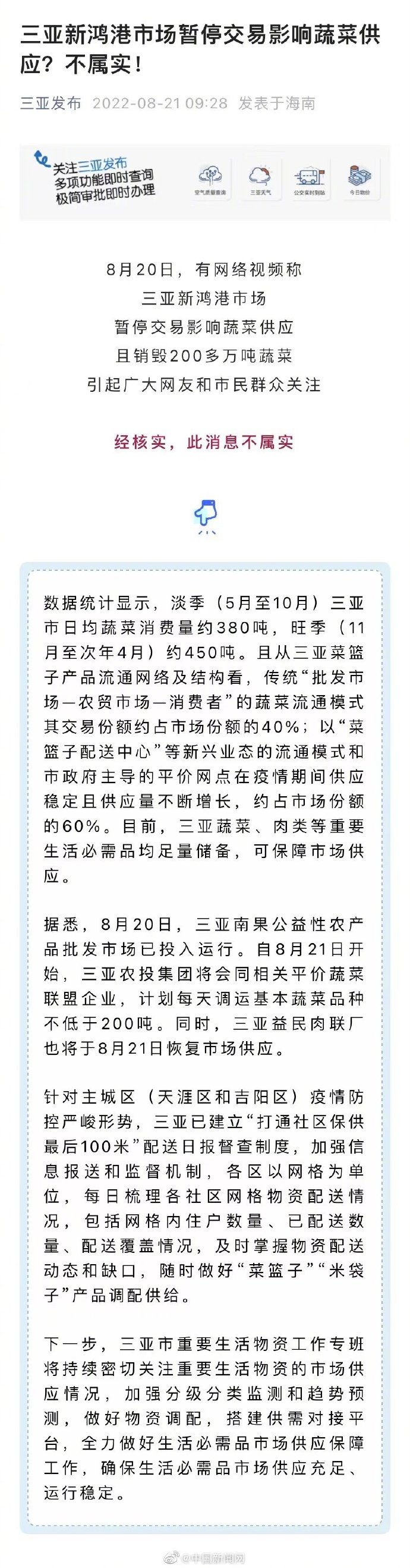 据三亚发布,8月20日,有网络视频称:三亚新鸿港市场暂停交易影响蔬菜供应且销毁200多万吨蔬菜,引起广大网友和市民群众关注。经核实,此消息不属实。目前,三亚蔬菜、肉类等重要生活必需品均足量储备,可保障市场供应。