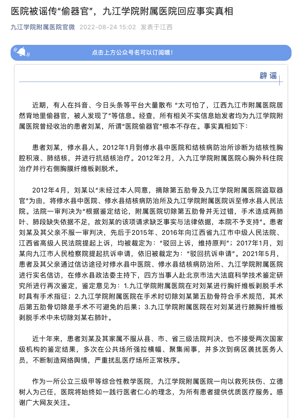 8月24日,据澎湃新闻,九江学院附属医院官方微信公众号发布消息:近期,有人在抖音、今日头条等平台大量散布“太可怕了,江西九江市附属医院居然背地里偷器官,被人发现了”等信息。经查,所有相关不实信息始发者均为九江学院附属医院曾经收治的患者刘某,所谓“医院偷器官”根本不存在。事实真相如下⬇️