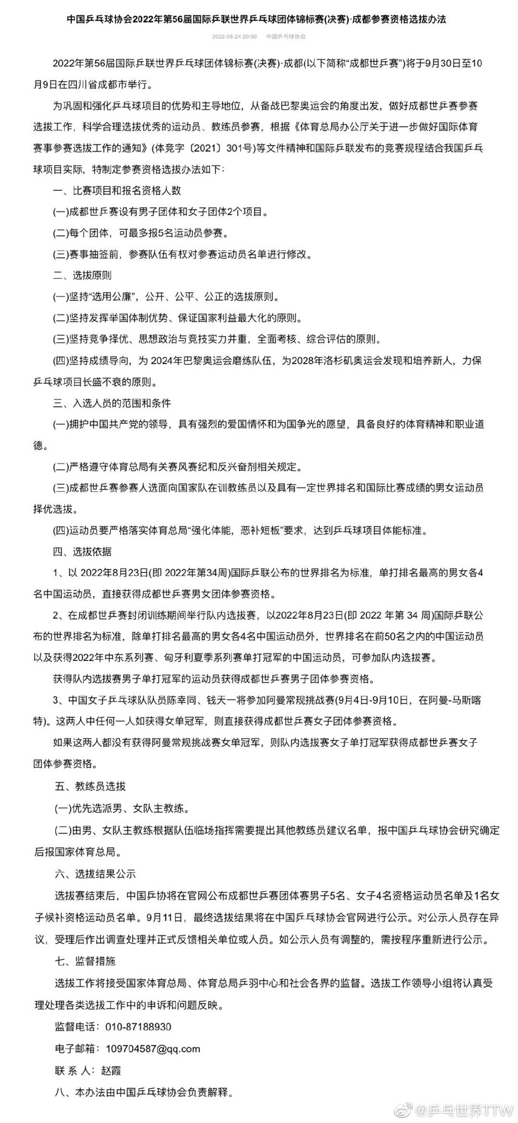 8月24日,中国乒协公布了成都世乒赛团体赛选拔办法。该选拔办法中明确,以2022年8月23日国际乒联公布的最新世界排名为标准,单打排名最高的男女各4名选手,直接获得成都世乒赛男女团体赛参赛资格。