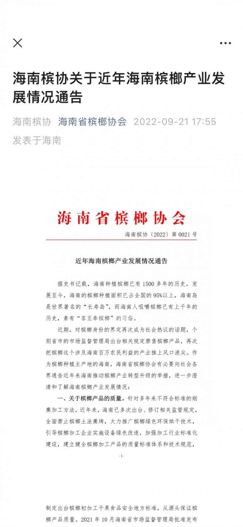 9月21日,海南省槟榔协会发文倡议,有关部门应建立健全相关法律法规和行业标准,加强槟榔行业全产业链的监管。加大药食同源的研究投入,开发出更多槟榔药用的延伸产品,提升槟榔制品的健康价值。
