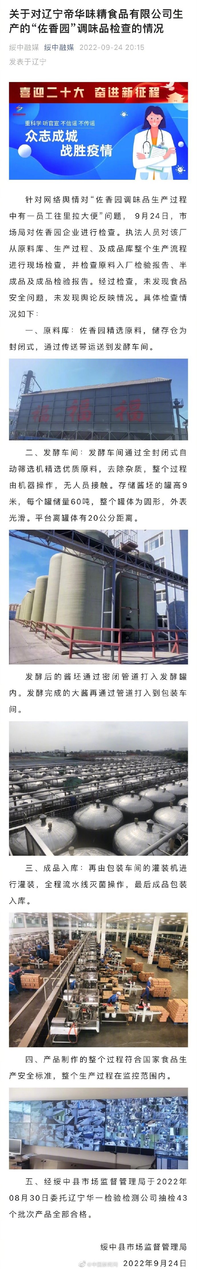据辽宁省葫芦岛市绥中县市场监督管理局9月24日消息,针对网络反映“佐香园调味品生产过程中有一员工往里拉大便”问题, 9月24日,该局对佐香园企业进行检查。经过检查,未发现食品安全问题,未发现舆论反映情况。