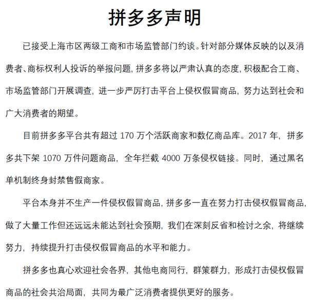 拼多多发声明回应称,将全力配合工商、市场监管部门开展调查,进一步严厉打击平台上侵权假冒商品,努力达到社会和广大消费者的期望。​