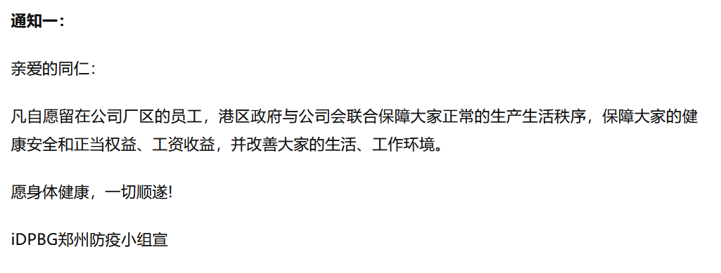 “郑州发布”微信公众号消息,10月30日下午,富士康内网连发三条通知,对自愿留在公司厂区的员工和意愿返乡员工分别进行了保障安排。