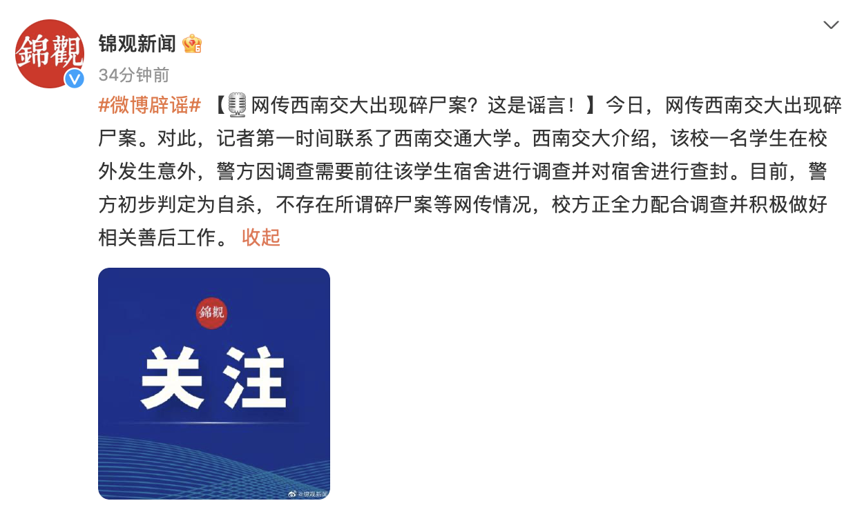 西南交大辟谣出现碎尸案:警方初步判定为自杀,不存在网传情况。