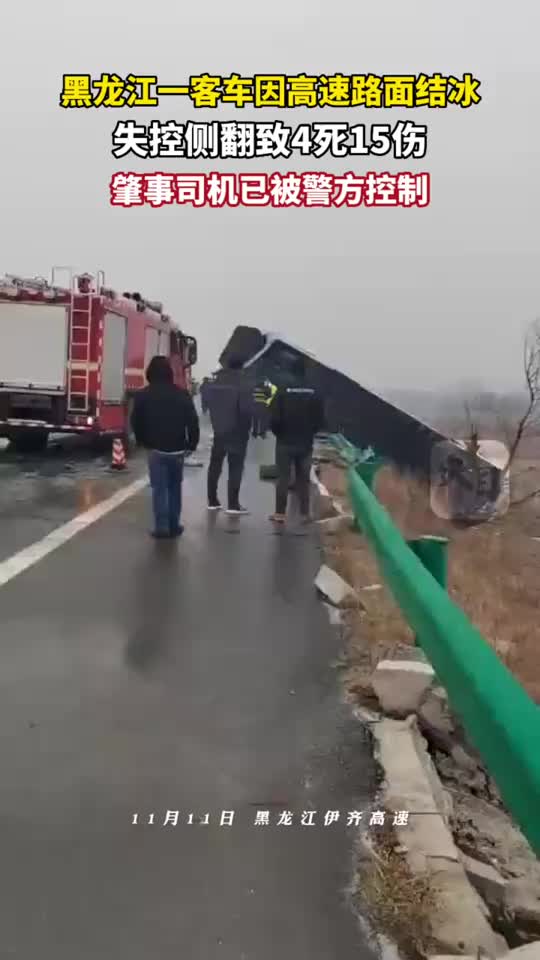 黑龙江一客车因路面结冰失控侧翻已致4死15伤,事故现场曝光。