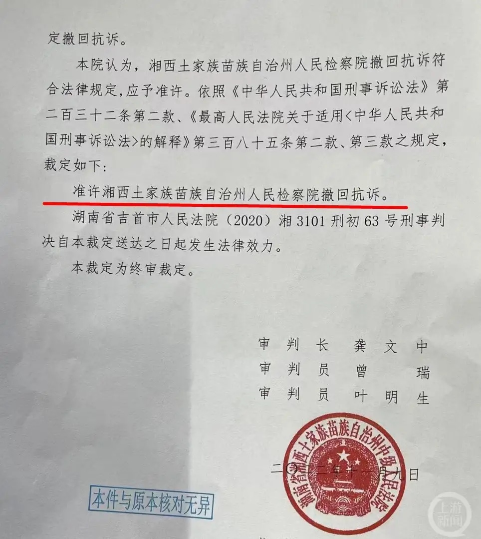 11月14日,上游新闻记者获悉,在等待两年之后,湖南邵阳的蒋华(化名)收到了湘西州中院发出的刑事裁定书:湘西州检察院认为抗诉不当,决定撤回抗诉,湘西州中院准许撤回抗诉,这意味着一审认定其系正当防卫的判决正式生效。