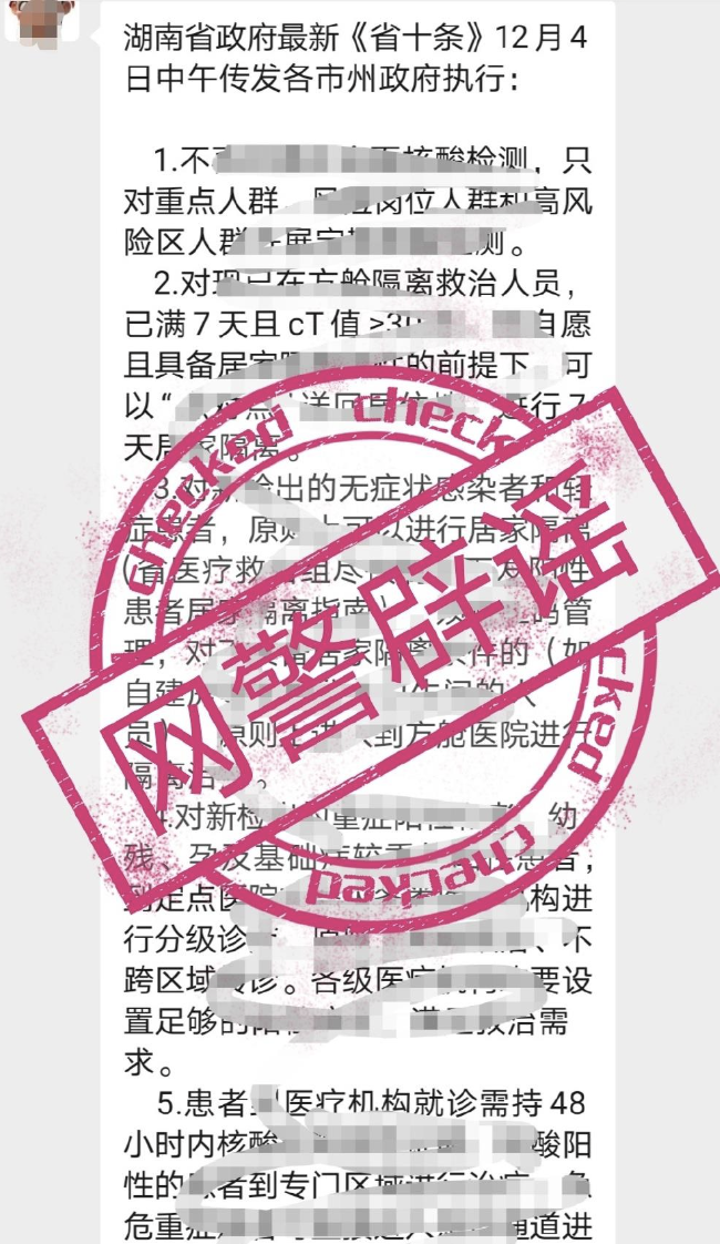 湖南网警辟谣:网传“省十条”系不实信息。