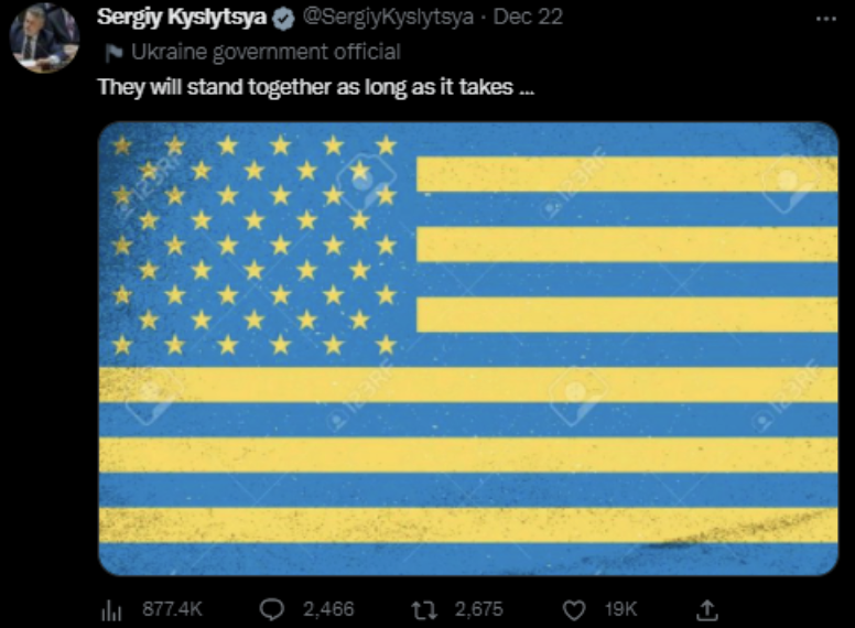 据环球网12月23日援引“今日俄罗斯”(RT)电视台网站报道,在乌克兰总统泽连斯基21日突访美国之际,乌克兰常驻联合国代表谢尔盖·基斯利察同日在社交媒体发布了一张“黄蓝色星条旗”的图片,以显示美乌团结。