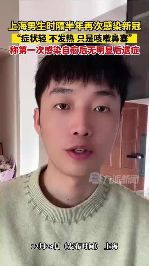 12月24日,上海男生一男生称时隔半年再次感染新冠,称第一次感染自愈后无明显后遗症。据男生自述,第一次阳是今年的3月29日,连续发烧了三天,第二次感染比起第一次感染没有发烧,胃口没有减少,全身有力气,只是咳嗽鼻塞。(via 九派新闻)