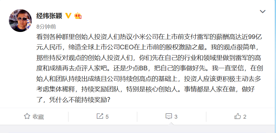 “看到各种群里创始人投资人们热议小米公司在上市前支付雷军的薪酬高达近99亿元人民币,缔造全球上市公司CEO在上市前的股权激励之最。我的观点很简单,那些持反对观点的创始人投资人们,你们先在自己的行业和领域里做到雷军的高度和成绩再去点评人家吧。还是少点BB,把自己的事做好先。我一直坚信,在创始人和团队持续出成绩且公司持续创高点的基础上,投资人应该更积极主动去多考虑集体稀释,持续奖励团队,特别是核心创始人。事情都是人家在做,做好了,凭什么不能持续奖励?”