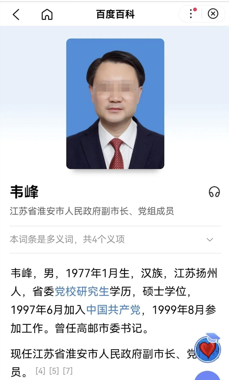 2021年8月,韦峰任扬州市政府党组成员、扬州市广陵区委书记,2022年2月任淮安市副市长。二人曾共事、属上下级关系。